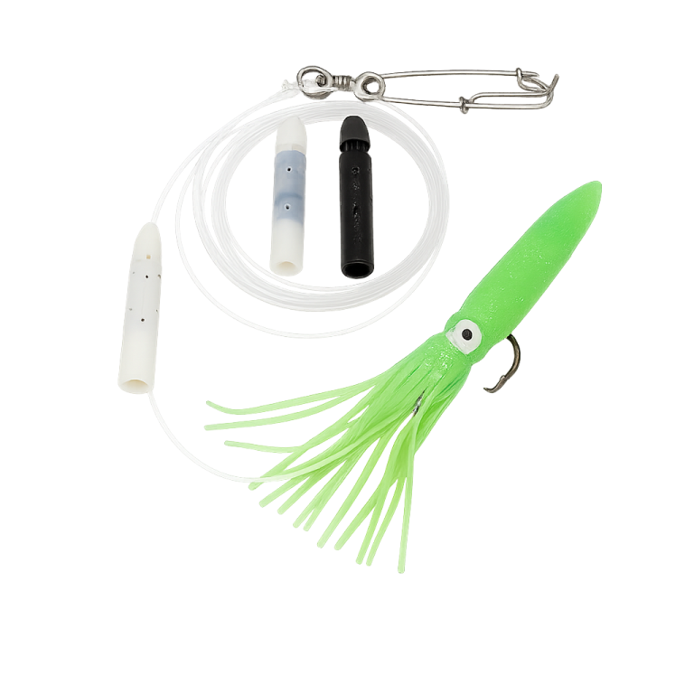 No gear modification is needed. LumoLeads attach quickly to monofilament lines using a patented collet chuck system, eliminating the need for crimping and preserving line strength. They can also be repositioned easily at sea.